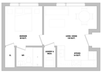 Living / Dining (130 sq. ft.) – Open-plan space designed for flexible furniture layouts and natural light.